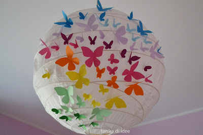 Otra opción para «tunear» una lámpara de papel básica tipo ikea es decorarla con mariposas de papel.
